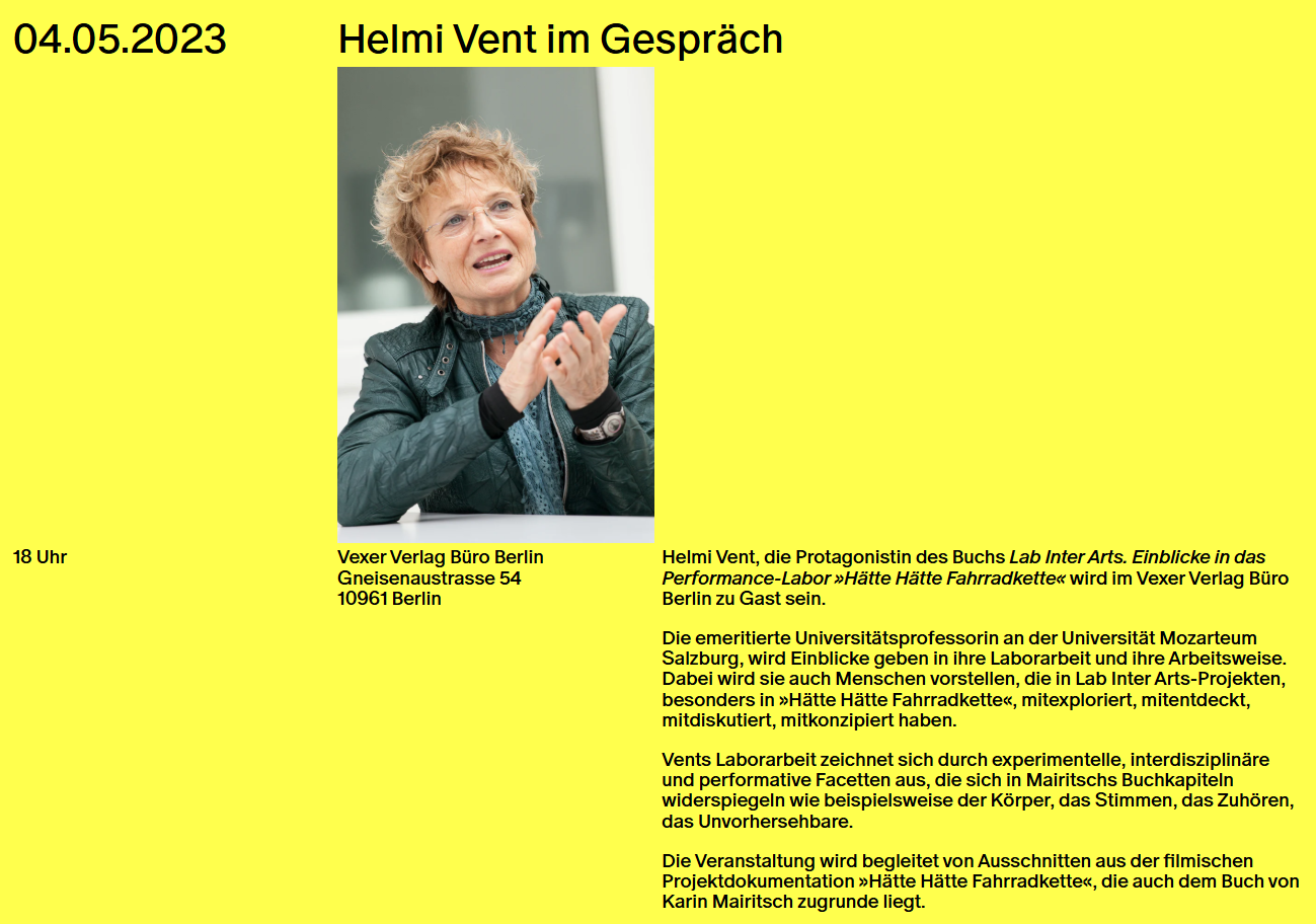 Helmi Vent in conversation: The event focuses on the book by Karin Mairitsch published by Vexer-Verlag Helmi Vent – Lab Inter Arts. Insights into the Performance Lab »Hätte Hätte Fahrradkette« [shoulda woulda coulda] (2020). The protagonist of the book will go through and flip through some of the book pages and talk about them with those present. A short version of the film project documentation »Hätte Hätte Fahrradkette«, which is based on the book by Karin Mairitsch, accompanies the event.